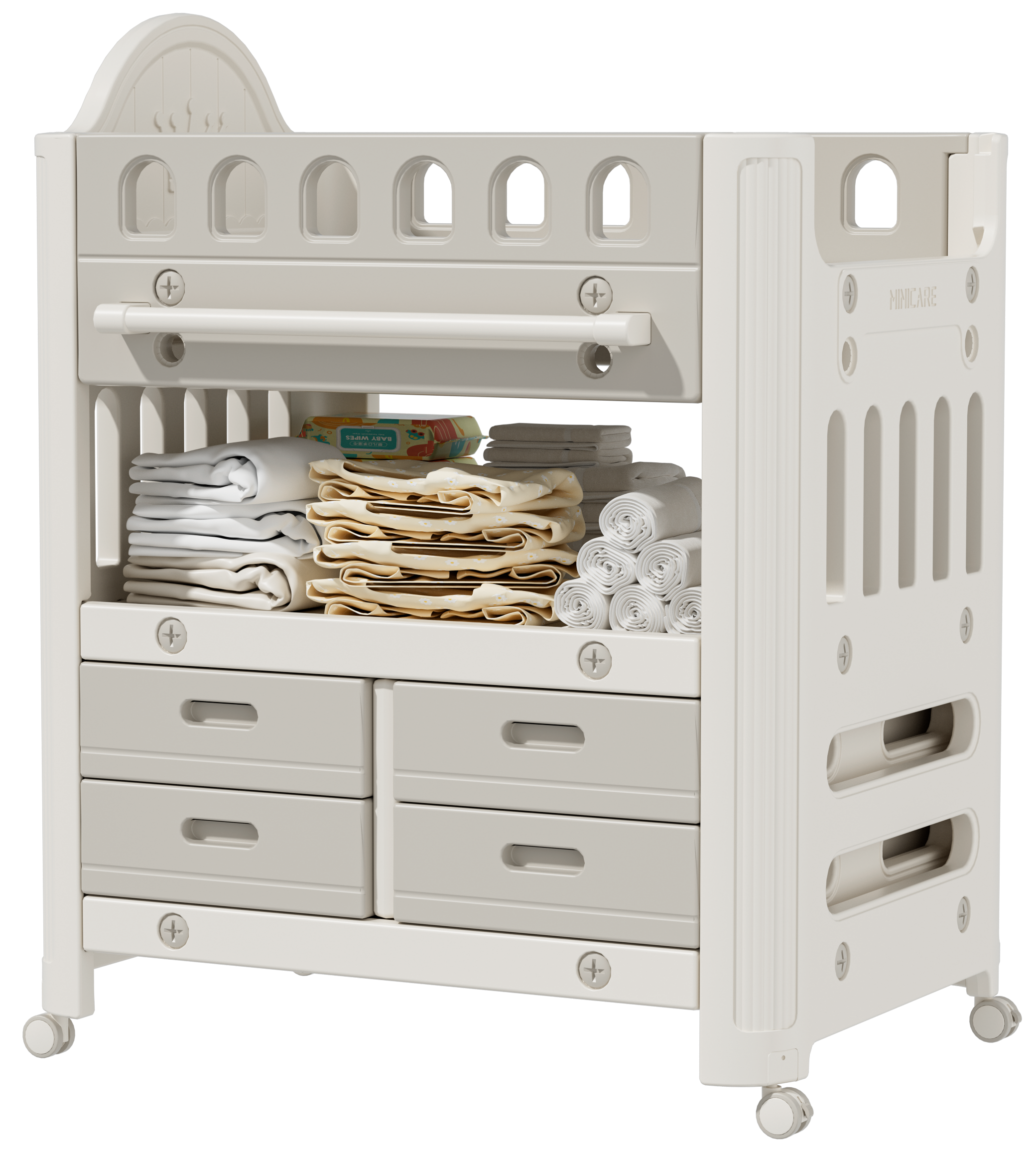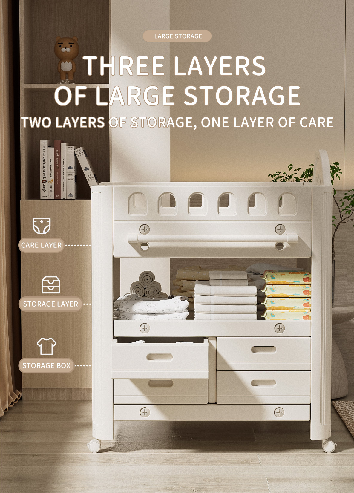 • All-in-One Changing Station – Multifunctional design for diaper changing, storage, and baby care essentials in one compact unit.
